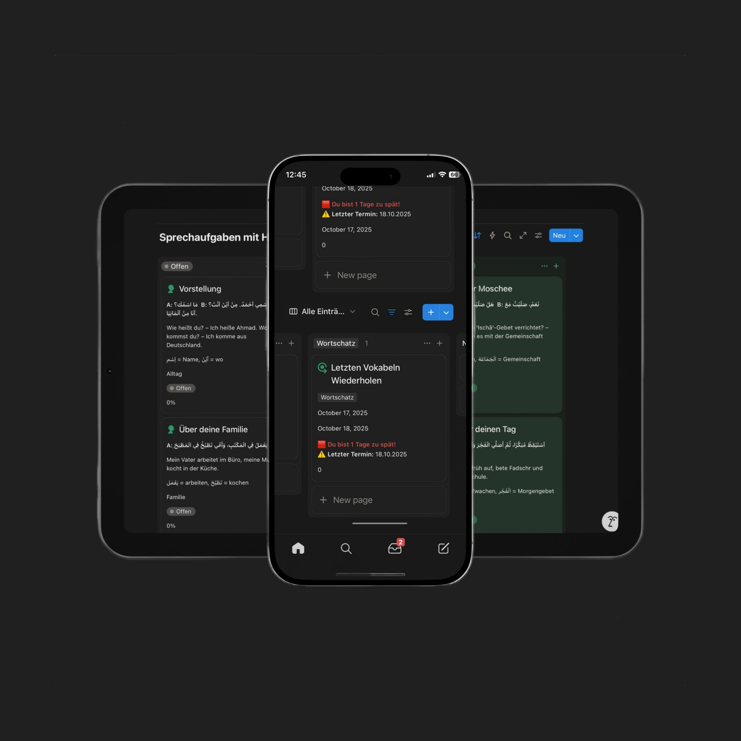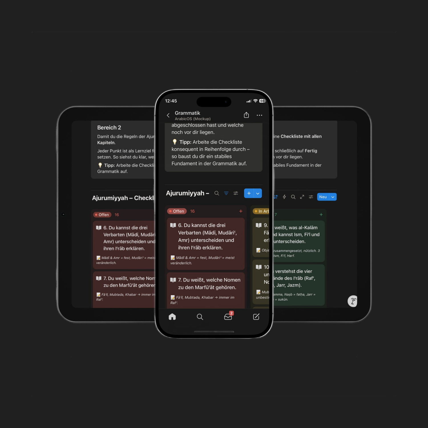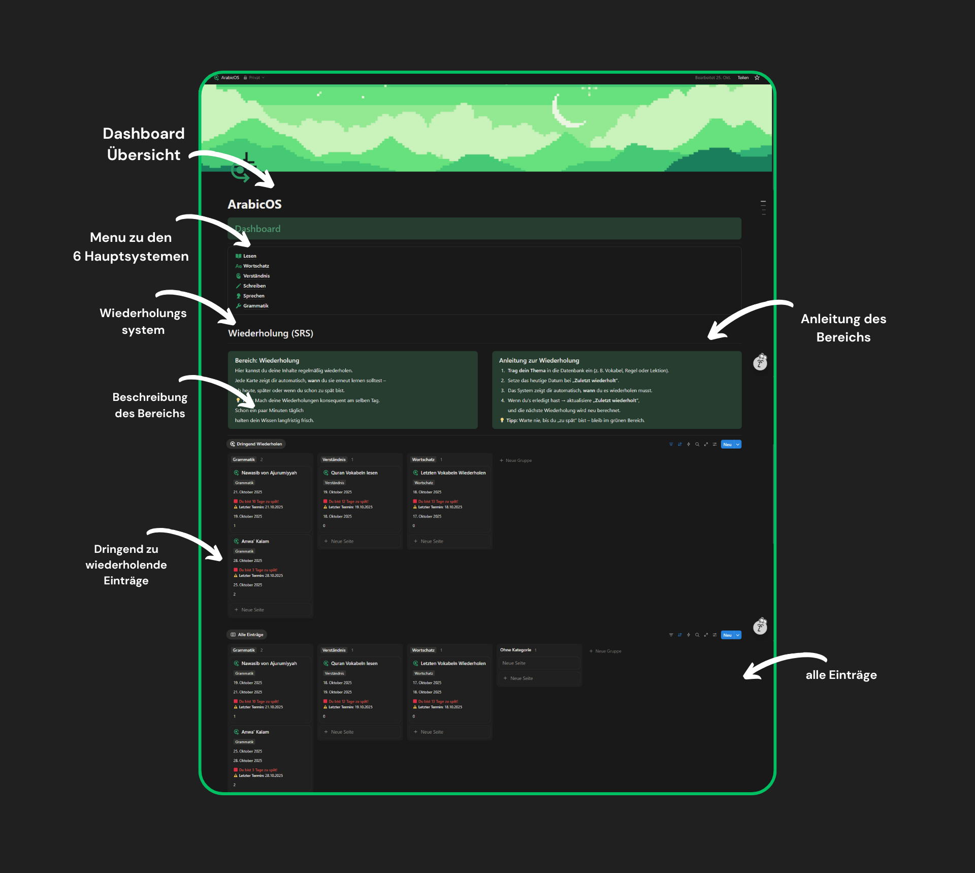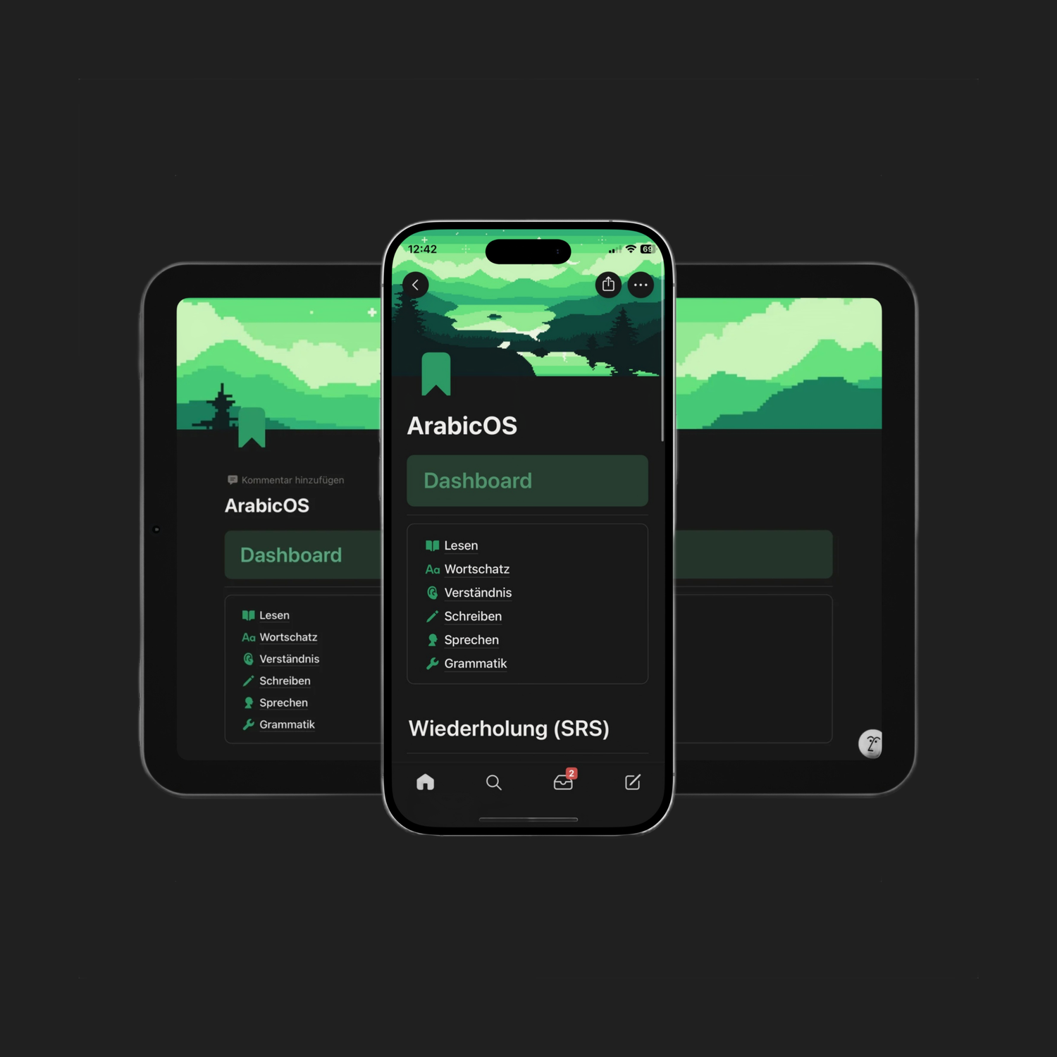 ArabicOS ist ein vollständiges Notion-System zum Erlernen der arabischen Sprache – mit klar aufgebauten Bereichen für Lesen, Schreiben, Sprechen, Grammatik, Wortschatz und Hörverständnis.