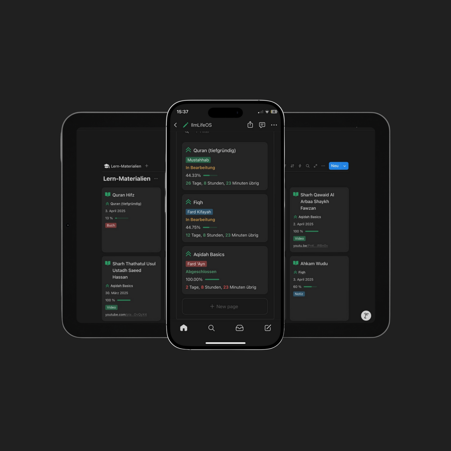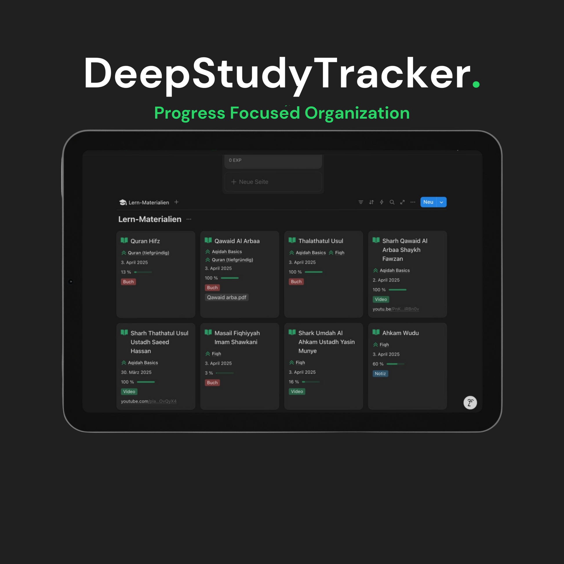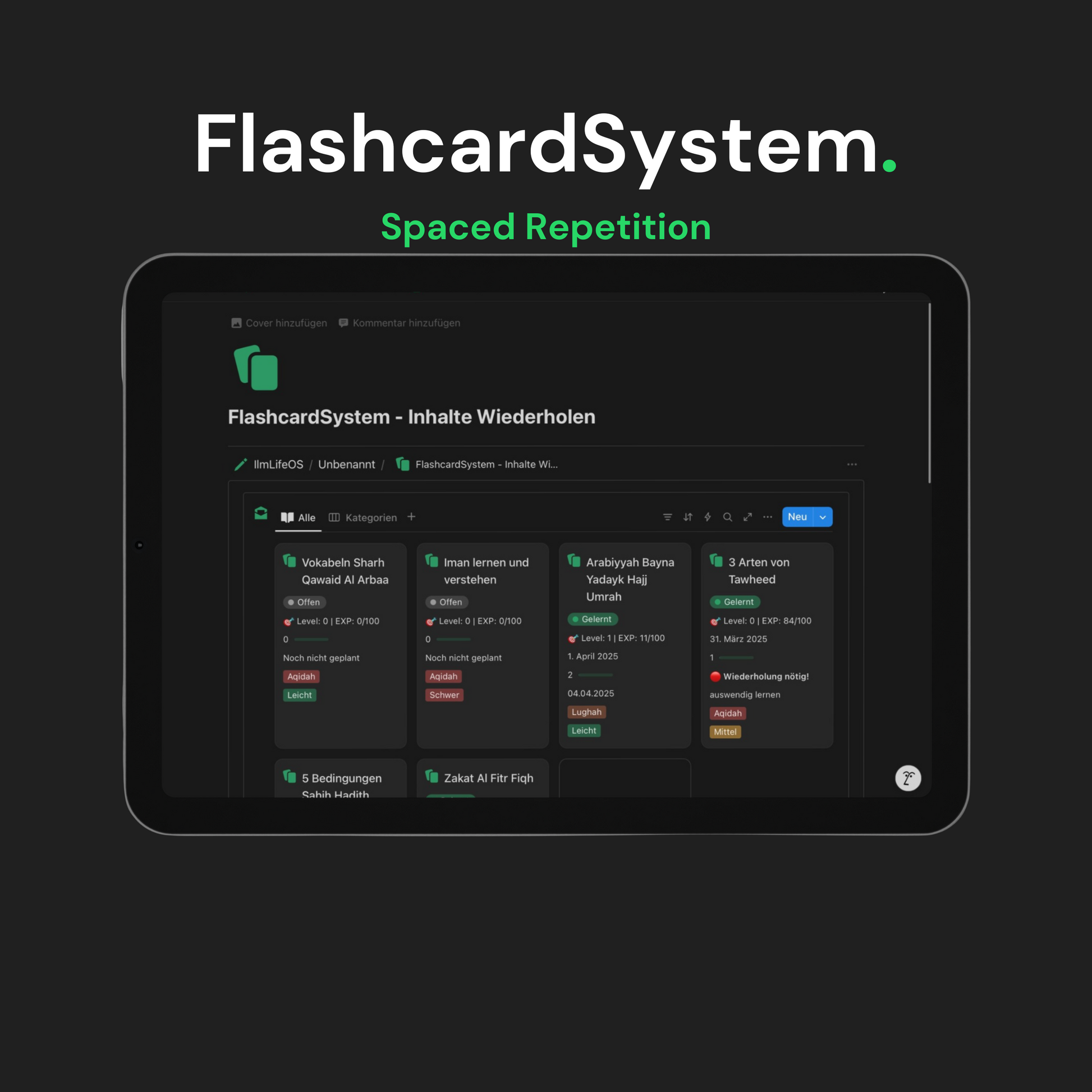 Karteikarten (Flashcards), Deep-Study-Tracker & Aufgabenplanung in einem klaren, digitalen System – ideal als Notion-Template für islamisches Lernen.